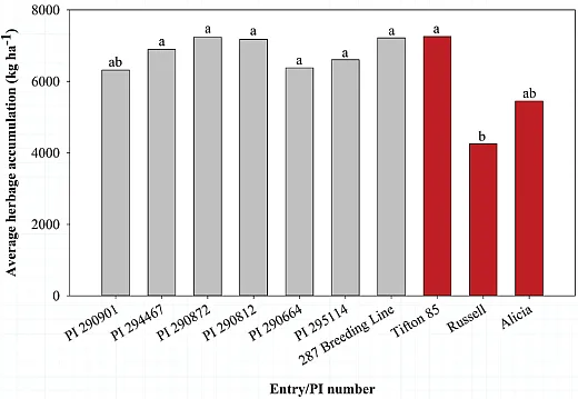 Further research is underway to evaluate herbage accumulation, spring recovery and survival, and bermudagrass stem maggot (BSM, Atherigona reversura) response of 10 hybrid bermudagrasses in northwest Georgia (Gates et al., 2021). The long‐term average minimum temperature at this site is 47.5°F, much cooler than the average minimum for Tifton, GA (54.9°F) where the germplasm was initially evaluated (UGA Weather Network, 2022). For two winters following establishment, severe cold temperatures (< 25.0°F) have been infrequent and brief. Although spring recovery was somewhat slow for some entries, there was no evidence of plant mortality. Visual spring recovery was highest for Alicia, intermediate for Tifton 85 and Russell, and lower for experimental entries. Accumulated forage was lowest for Russell, intermediate for Alicia, and highest for Tifton 85 and all of the experimental hybrids (Figure 3). These new experimental hybrids show promise, but this research should continue to better understand how these varieties will respond the extreme freeze events.