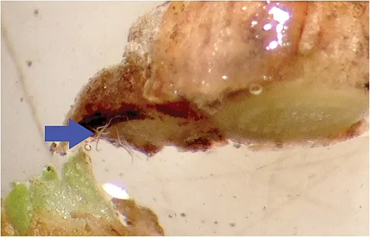 Stem nematodes are crop specific and can reproduce on alfalfa and survive on sainfoin, a legume forage. As with other plant‐parasitic nematodes, stem nematodes use a hollow needle‐shaped stylet to puncture plant tissue to feed.