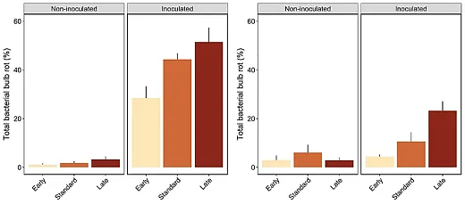 While onion plants can be infected by bacterial pathogens at any time during development, they are most susceptible to infection close to harvest when the pathogens more readily enter the neck of the onion plant in splashing water from rain or overhead irrigation. The bacterial pathogens colonizing the neck can then move down towards the bulb as the neck softens naturally and the leaves collapse (referred to as “tops down”). This early stage of senescence of the leaves and neck is a high‐risk period for bacterial infection as the leaves and neck start to die and have not yet dried completely, i.e., neck tissues no longer can resist bacterial infection, and there is still some moisture in the neck, which bacteria need to multiply, colonize, and move in the necks.