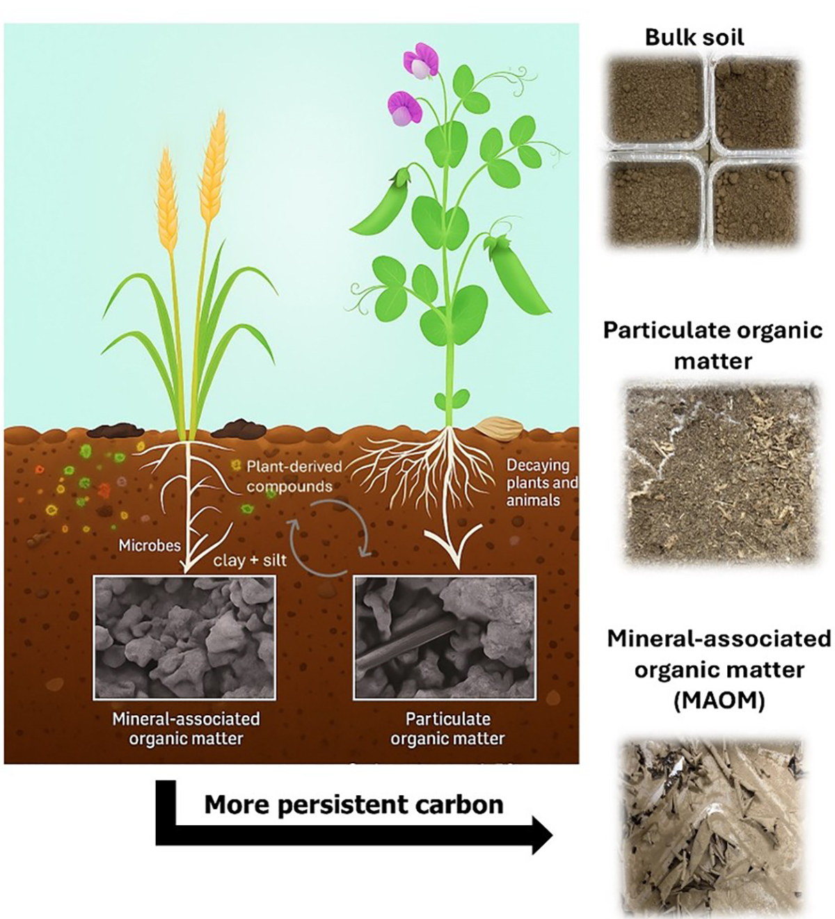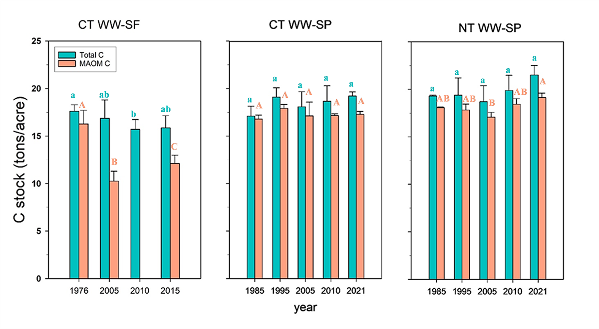 Therefore, this study explores (i) how legumes like spring peas fit into wheat rotations and (ii) how different tillage methods impact C compared with the WW-SF system. A key focus of this study is the different types of soil organic C fractions: (i) particulate organic matter (POM) that breaks down quickly and (ii) mineral-associated organic matter (MAOM) that binds to minerals and locks in carbon for the long term. This study focused on total C and MAOM-C under different treatments.