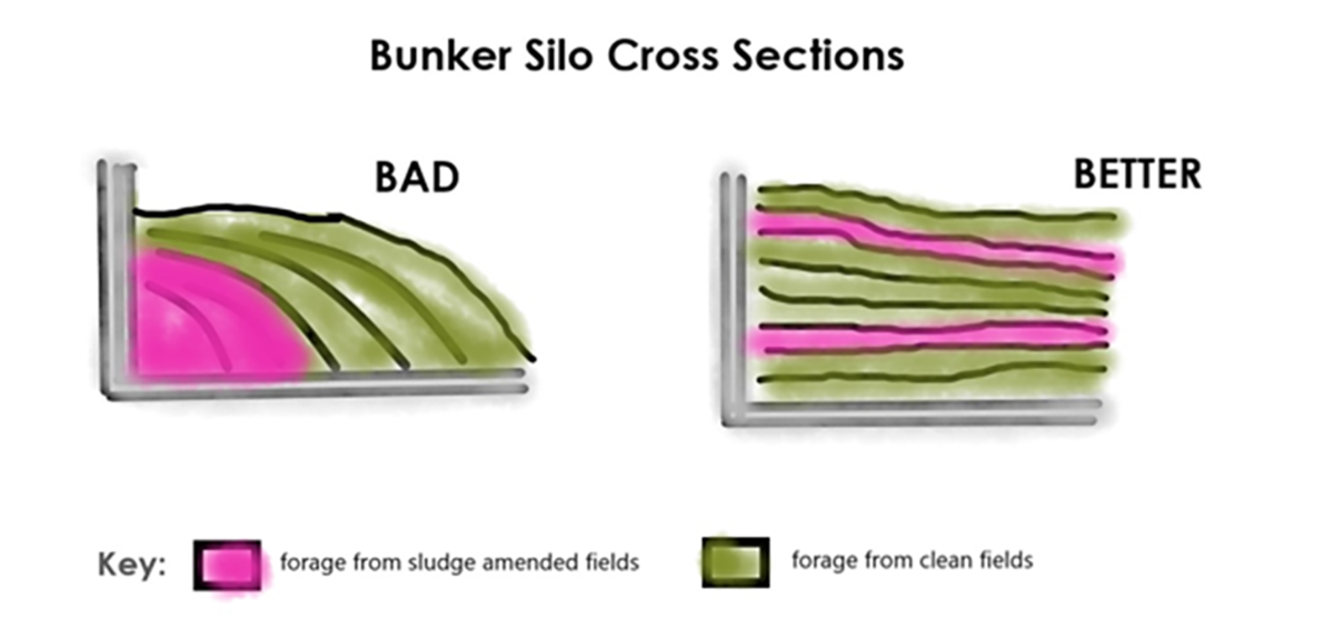 Alter grazing and feeding strategies to minimize the impact on livestock. Dilute contaminated forage with non-contaminated forage and use clean pastures and feed during critical times. To implement this strategy, it is important to label bales or keep records of the fields from which they were harvested. Likewise, bunker silos should be segregated by fields if possible or filled in a way that avoids the possibility of feeding out undiluted feed (Figure 4).