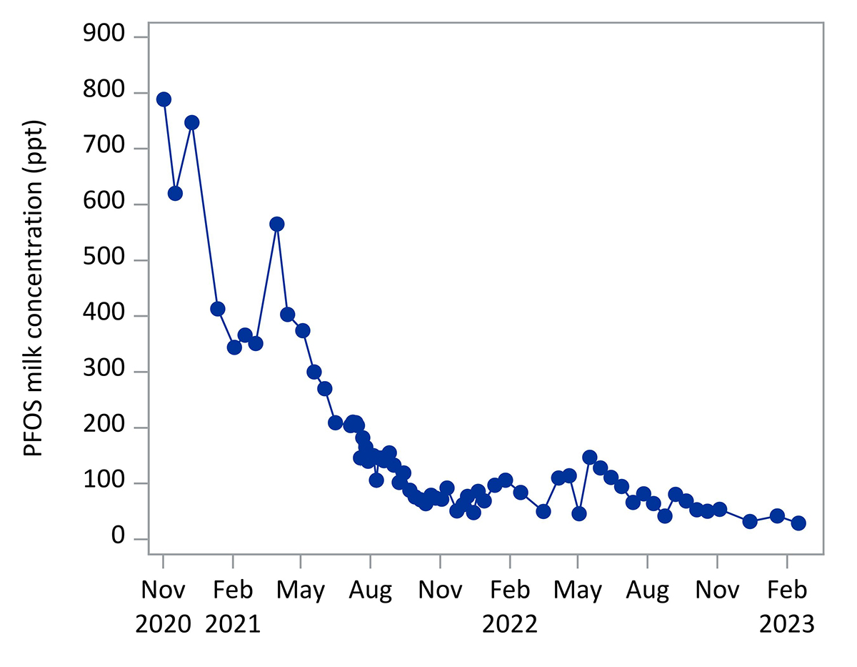 Levels of PFAS in livestock (blood, tissue, and milk) decrease over time once exposure is reduced or eliminated (Figure 3). The half-life of PFOS in dairy cows is estimated to be between 4 and 10 weeks (Lupton et al., 2025), and herds can be successfully depurated.