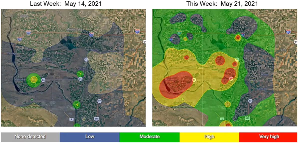The weekly Potato Alerts report had been showing dots on a map to indicate pest counts. The heat maps that the WSU entomologists developed provided a better visual picture of pest pressure. By eliminating the dots, the heat maps were also less field-specific. That sat well with growers concerned about anonymity.