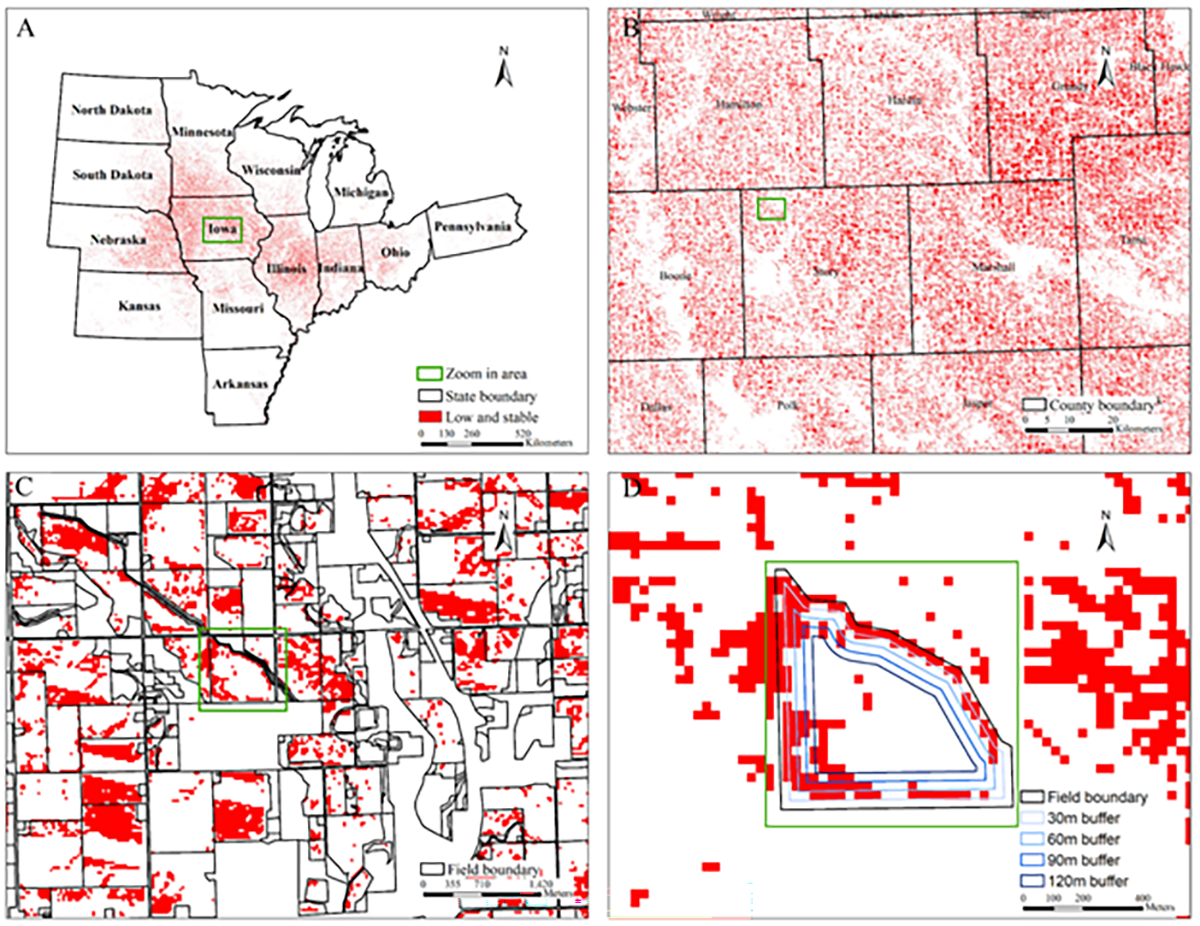 Through this analytical process, 24 million acres of stable–low zones were identified across the U.S. Midwest (Figure 1). Across the Midwest, approximately a third of the acres could be classified as low, stable zones (Table 1).