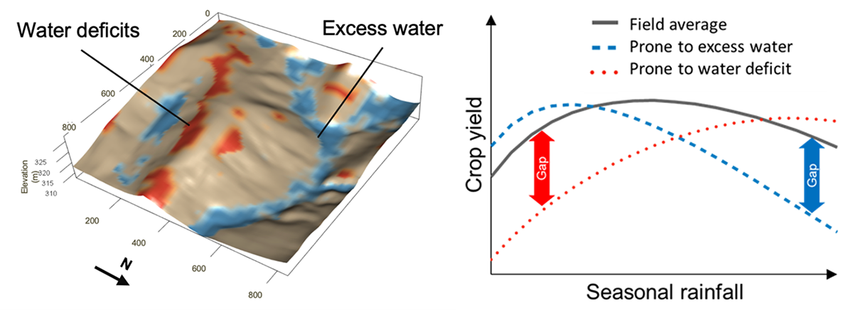 Dynamics of these yield zones are directly related to soil water across the landscape. There is a strong relationship between soil water availability and nitrogen response (Hatfield, 2012), and limited response to nitrogen is exhibited across the Midwest soils with low organic matter (low water-holding capacity). Seasonal patterns of rainfall show that late-summer rainfall doesn’t meet crop water demand, and with the limited soil water-holding capacity, corn is subjected to water stress, which ultimately limits its ability to utilize nitrogen in the soil profile (Maestrini & Basso, 2018). A typical topographic representation of a field shows areas that are prone to water deficits and water excesses (Figure 2). Examining areas of the field prone to either water deficits or water excesses relative to the seasonal rainfall shows how these areas affect the yield across the field (Figure 2).