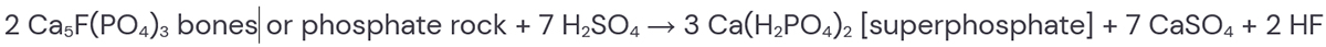 Observations that not all bones were equally effective as a plant-nutrient source led to experimentation to acidify the bones before adding them to soil. One early British innovator, John Lawes, applied raw bone to his fields without seeing additional crop growth. This led him to experiment with treating bones with sulfuric acid, which proved to be very effective for crops. In 1842 he was granted a patent for “superphosphate of lime”, composed of calcium hydrogen phosphate and calcium sulfate (see equation below):