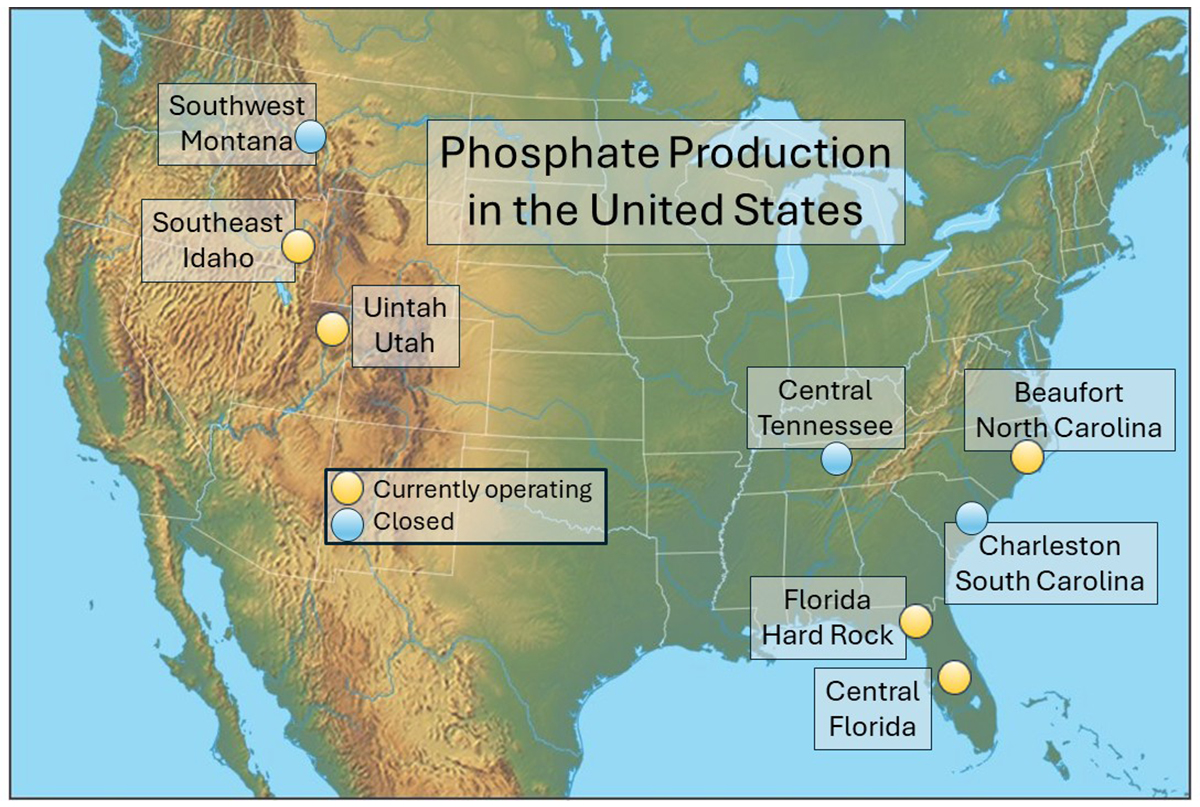 Western U.S. deposits from the “Phosphoria formation” are found in southeastern Idaho, western Wyoming, northern Utah, and southwest Montana. This resource was discovered in the early 1900’s and commercial development began in the middle of the 20th century. Several open-pit mines exist across the region, with most of the current production centered near Soda Springs, Idaho, currently operated by JR Simplot and Itafos, and near Vernal, Utah.