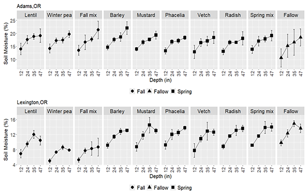 - At the Lexington site, soil water content following fall-sown cover crops was