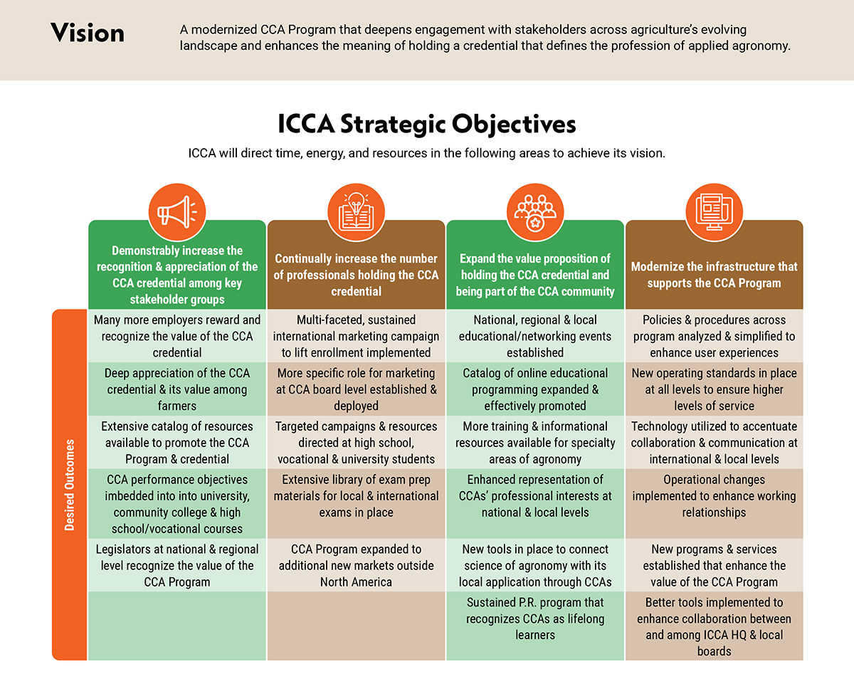 A new five-year strategic plan was approved by the International Certified Crop Adviser (ICCA) Board during a meeting in Denver, CO August 19-21, 2025. The plan is the culmination of a six-month process that involved a task force composed of local CCA board members and administrators, the ICCA Executive Committee, and staff. The plan, which will commence in 2026, is intended to reflect the CCA program’s vision for how it will meet the challenges ahead and outlines how time, energy, and resources will be used.