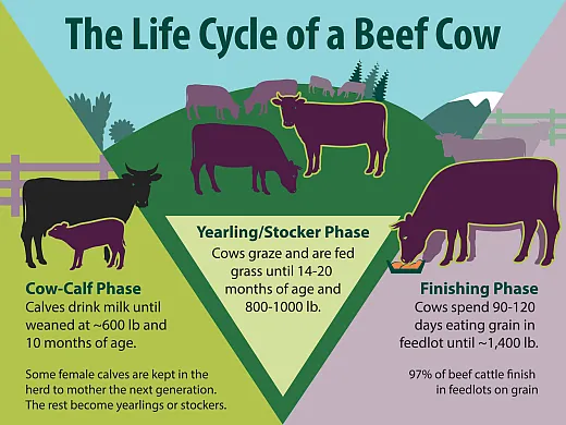 In the United States, beef production starts with cow‐calf operations. Ideally, every year, a mother cow gives birth to a calf weighing somewhere between 60 and 100 lb. Kept in cow‐calf pairs, ranchers send the cows out on grazing land where the mother cow feeds on forage and the calf drinks mother’s milk for the first eight or nine months of its life. Then the rancher weans the calves when they’re about 600 lb. Some female calves (usually about a third) are kept, becoming mother cows the next year; the rest are sent out in their own herds and called yearlings or stockers.