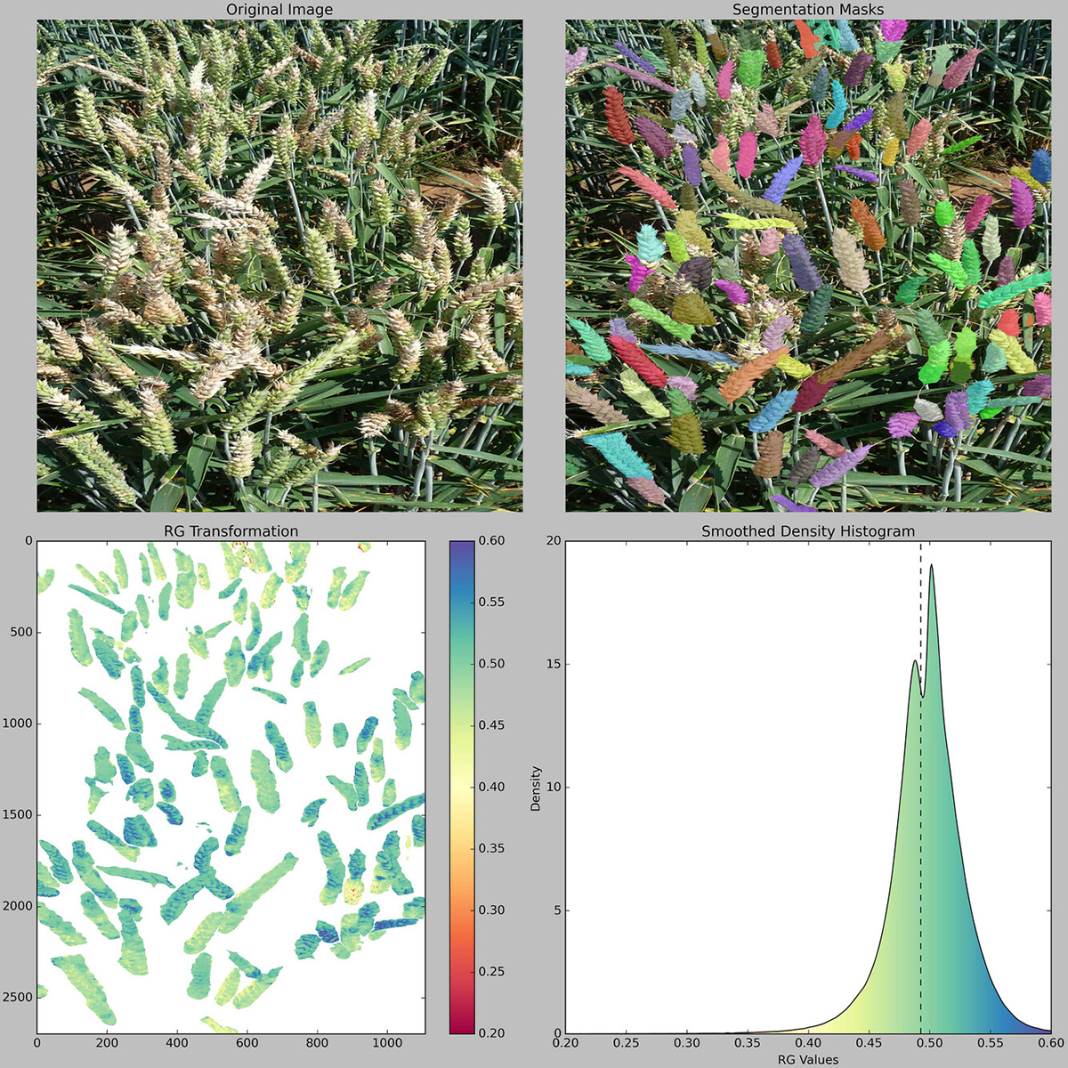 The point of isolating these pixels is to analyze them further—for disease, for example. And for this last step, Sulik proposed using an “old school” tool, the spectral index. To rate FHB severity, the technique uses specific red and green bands of light, captured by a cell phone camera, to calculate the degree to which each wheat head pixel is bleached—signifying infection—or green—signifying health. Each pixel value is then compared to a threshold value for disease experimentally determined by McConachie. Pixels falling above the threshold are scored as healthy and those below it as infected. Finally, disease severity is estimated by counting the number of pixels above the threshold and then dividing by the total number of pixels in the wheat head image.