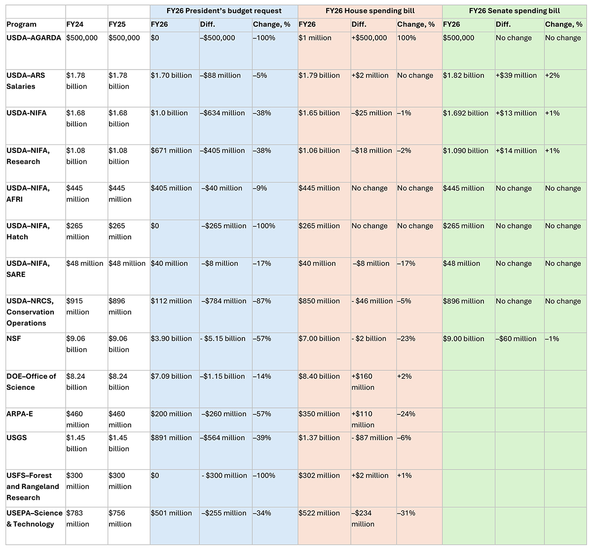 Both the House and Senate spending bills for agriculture and the Food and Drug Administration provided flat funding for USDA research programs including ARS and NIFA competitive and capacity programs. National Science Foundation (NSF) funding is flat-funded in the Senate, but the House provided a cut of $2 billion. A compromise funding amount will need to be determined as the process moves forward, but even the cut proposed in the House is far less than the $5 billion cut put forward in the president's budget.