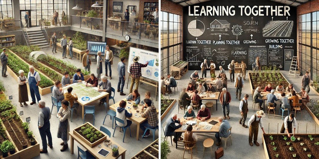 Curious about how emerging technologies might assist in visualizing these settings, I asked ChatGPT to generate images of a high school agricultural program functioning as an intergenerational shared site. I provided prompts that emphasized co-learning, civic engagement, and collaborative inquiry focused on supporting local agriculture. The image outputs—two of which are shown below—depict dynamic, inclusive educational spaces grounded in community values.
