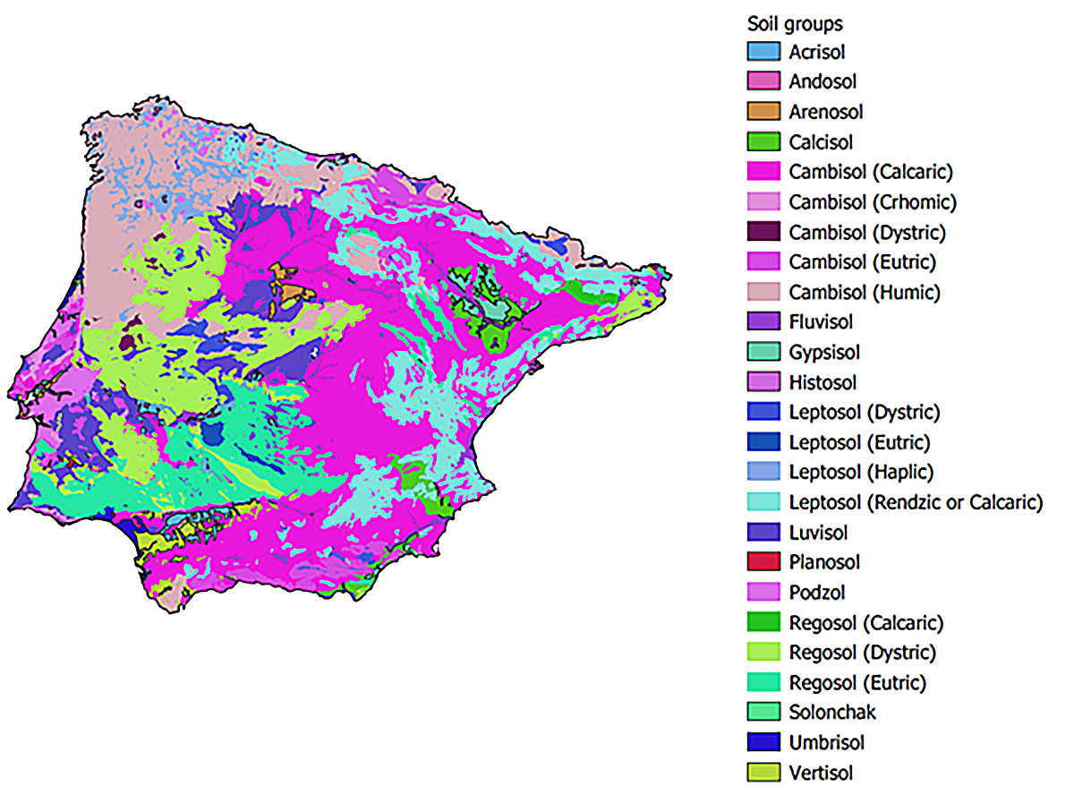 The landscape of the Iberian Peninsula is incredibly diverse. According to the World Reference Base, there are 25 soil groups throughout the whole peninsula. Original figure credited to the IUSS Working Group. Own elaboration from ESDAC, ESDB v2.0, 2004.