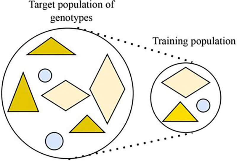 First, breeders select the initial plants they want to use to train their model. From this group, the breeders will want to enhance a trait. Maybe the plants the breeder is working with are from a species that can produce different colored flowers, and they want the new line to only produce purple flowers. It isn’t possible to train a model using all possible plants at their disposal, so breeders will choose a subsection of these plants to start with. Whether breeders are starting completely from scratch or have data from past breeding programs, they want to make sure the plants in their training population represent the initial population’s genetic diversity.