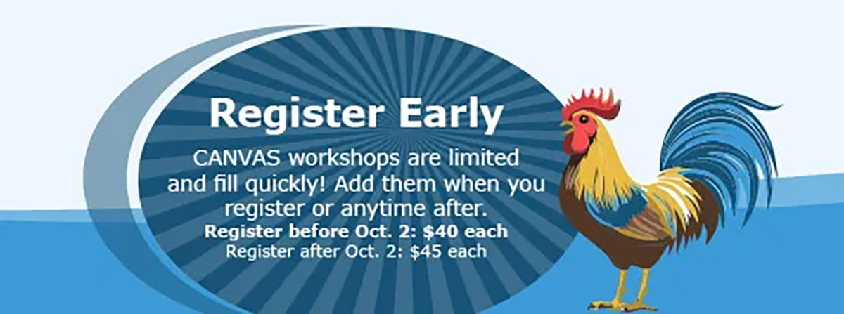 You can add any of the workshops below after you complete your CANVAS registration. Workshops are limited to 30 individuals and often sell out. Please register in advance to reserve your seat and take advantage of the early bird discount ($40 if you register before October 2; $45 if you register after).