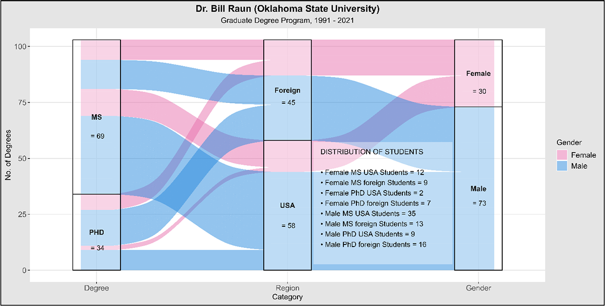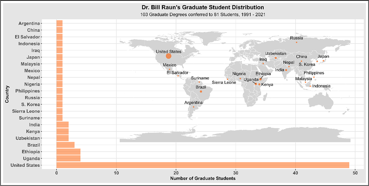 The central focus of Dr. Raun’s 30-year career at OSU, from its beginning to its untimely end, was students (Figure 1). He chaired 103 degree programs as major professor conferred to more than 81 students from 22 different countries (Figure 2). Overall, he served as a major professor on 69 M.S. and 34 Ph.D. degrees (Figure 3). His lab was diverse: Of the 103 students earning their degrees under his supervision, 45 were international, 58 domestic, 30 female, and 73 male (Figure 3). Twenty-three students received both their M.S. and Ph.D. under Dr. Raun’s supervision.