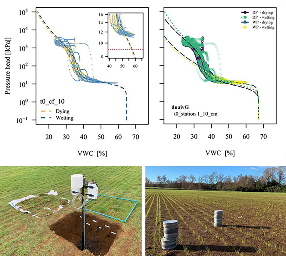 Combining laboratory and field approaches, researchers analyzed soil water retention and movement over two years, at both wetting and drying cycles, at multiple depths, and at three compaction levels. Volcanic ash soil—an arable soil that’s physical and hydraulic properties change over time—was used for this study. The collaborative team evaluated temporal changes in soil water retention by testing two forms of the widely used van Genuchten model, designed for modeling water retention in a variety of soil textures. Results showed that compaction reduced the variability of water retention behavior by collapsing pore networks, but this also led to extreme behavior. Although wetting and drying cycles did not directly alter model parameters, they helped identify shifts in flow homogeneity, suggesting that pore connectivity and flow paths change over time.