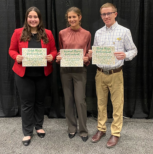 The team, consisting of Marissa Folkers, Sydney Rider, and Delaney Salm, achieved first place in the overall team competition while Sydney Rider placed first in the individual competition. South Dakota State University placed second in both team and individual competition.